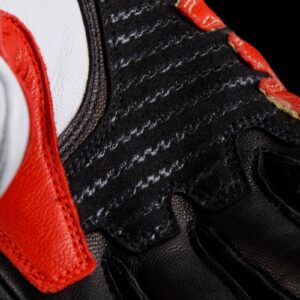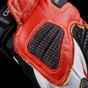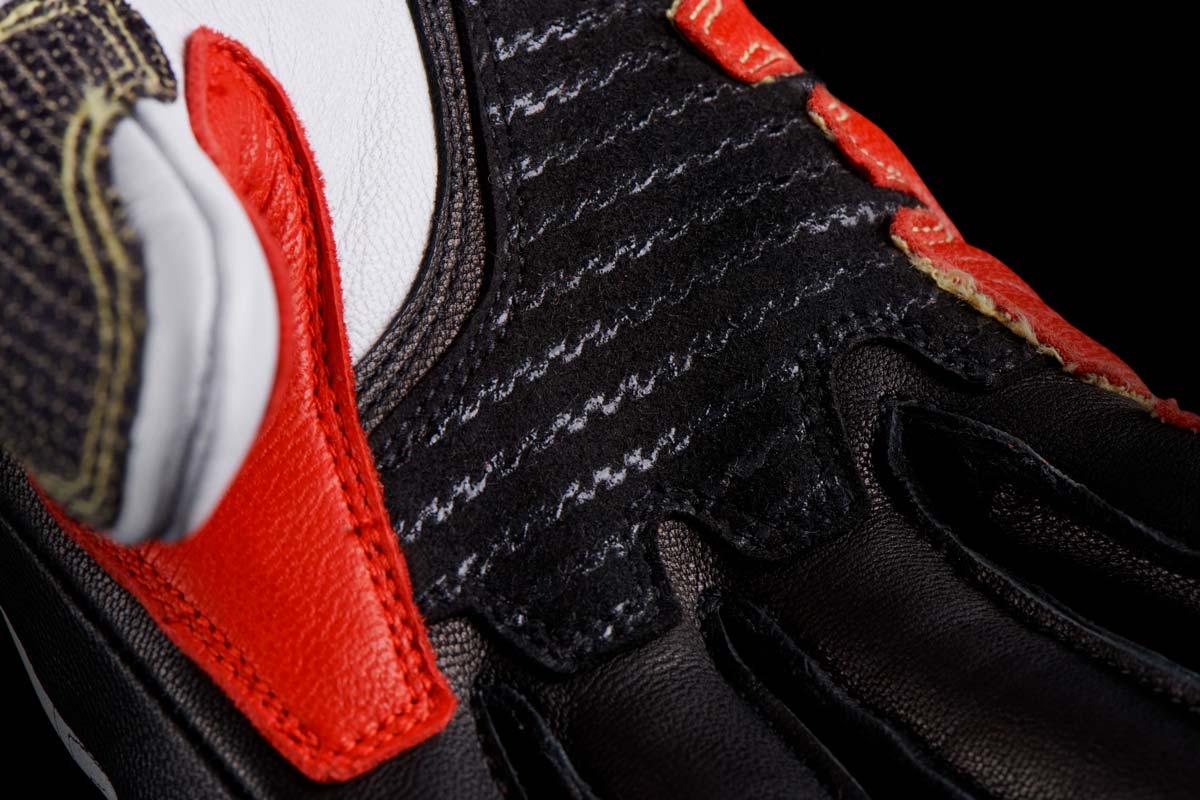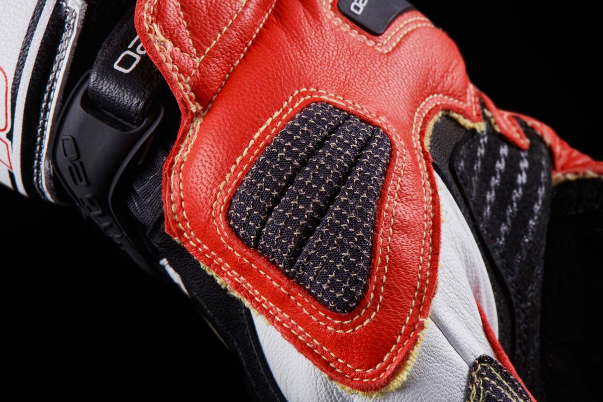 – La tranche de la main, la paume et l’auriculaire, ont fait l’objet d’un soin spécifique. Particulièrement exposé, le renfort de cette zone a été conçu d’une seule pièce, renforcé de fibres de Kevlar®, et pensé pour un recouvrement optimal, tout en veillant à ne jamais entraver la mobilité de la main.